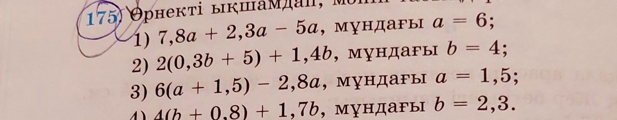 175) Өрнекті ықшамдап, мәнін табыңдар: 1) 7,8а + 2,3а - 5а, мұндағы а = 6; 2) 2(0,3b + 5) + 1,4b, мұндағы b = 4; = 3) 6(а + 1,5) - 2,8а, мұндағы а = 1,5; = 4) 4(b + 0,8) + 1,70, мұндағы b 2,3. дам 90 баллов