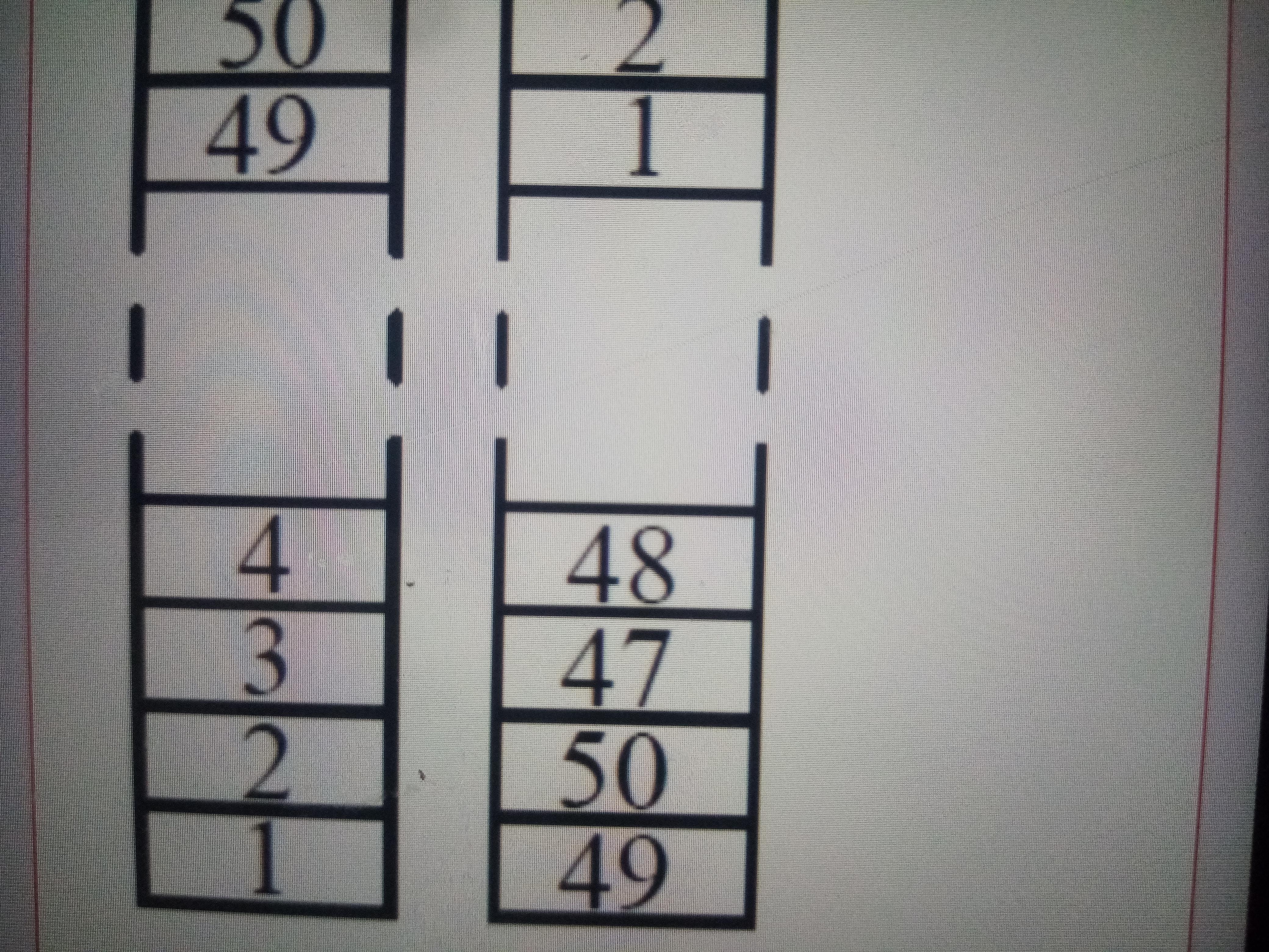 На столе стоит башня из блоков с номерами от 1 до 50. Ляззат строит из неё новую башню следующим образом: она берёт два блока с вершины исходной башни и кладёт их на стол в качестве основания новой башни. Затем она берёт два верхних блока из оставшейся части исходной башни и кладёт их на вершину новой башни, и так далее, как показано на схеме. Какие два числа из перечисленных пар находятся на соседних блоках в новой башне?