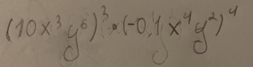 (10x³y⁶)³ * (-0,1x⁴y²)⁴ = 1000x⁹y¹⁸ * 0,0001x¹⁶y⁸ = 0,1x²⁵y²⁶