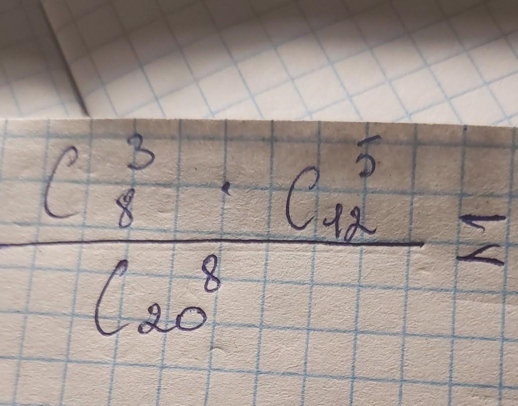 у мішку лежит 20 кульок однакових на дотик куль.: 12 білих і 8 чорних . з мішка навмання витягнули 8 куль. яка ймовірність того , що рівно три з них чорні ?