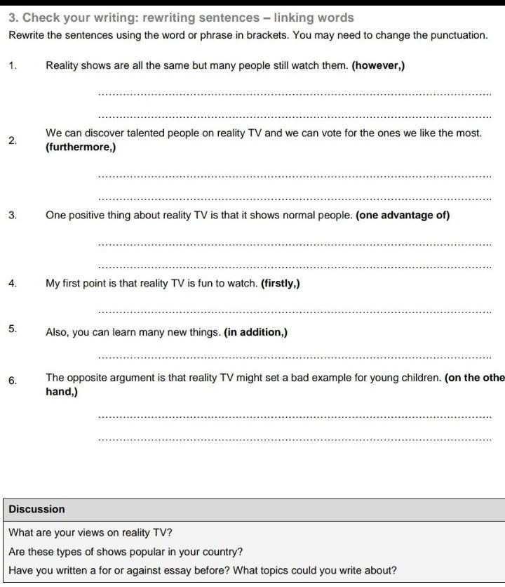 3. Check your writing: rewriting sentences - linking words Rewrite the sentences using the word or phrase in brackets. You may need to change the punctuation. Reality shows are all the same but many people still watch them. (however,) 1. 2. 3. 4. 5. 6. We can discover talented people on reality TV and we can vote for the ones we like the most. (furthermore,) One positive thing about reality TV is that it shows normal people. (one advantage of) My first point is that reality TV is fun to watch. (firstly,) Also, you can learn many new things. (in addition,) The opposite argument is that reality TV might set a bad example for young children. (on the othe hand,) Discussion What are your views on reality TV? Are these types of shows popular in your country? Have you written a for or against essay before? What topics could you write about?