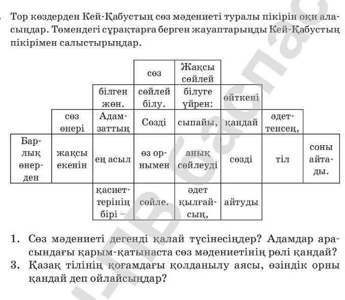 Тор көздерден Кей-Қабустың сөз мәдениеті туралы пікірін оқи ала- Кей-Қабустың сындар. Төмендегі сұрақтарға берген жауаптарынды пікірімен салыстырыңдар. Бар- лык өнер- ден СӨЗ бiлген сөйлей жен. СӨЗ Адам- Өнерi заттың жаксы екенін ең асыл Жақсы сөйлей білуге білу. үйрен: Сөздi сыпайы, қандай анық өз ор- нымен сөйлеуді әдет Өйткені қасиет- терiнiн сейле. кылгай-айтуды бiрi - сың, сөзді па әдет- тенсең, тіл СОНЫ айта- ды. 1. Сөз мәдениеті дегенді қалай түсінесіңдер? Адамдар ара- сындағы қарым-қатынаста сөз мәдениетінің рөлі қандай? 3. Қазақ тілінің қоғамдағы колданылу аясы, өзіндік орны кандай деп ойлайсындар?