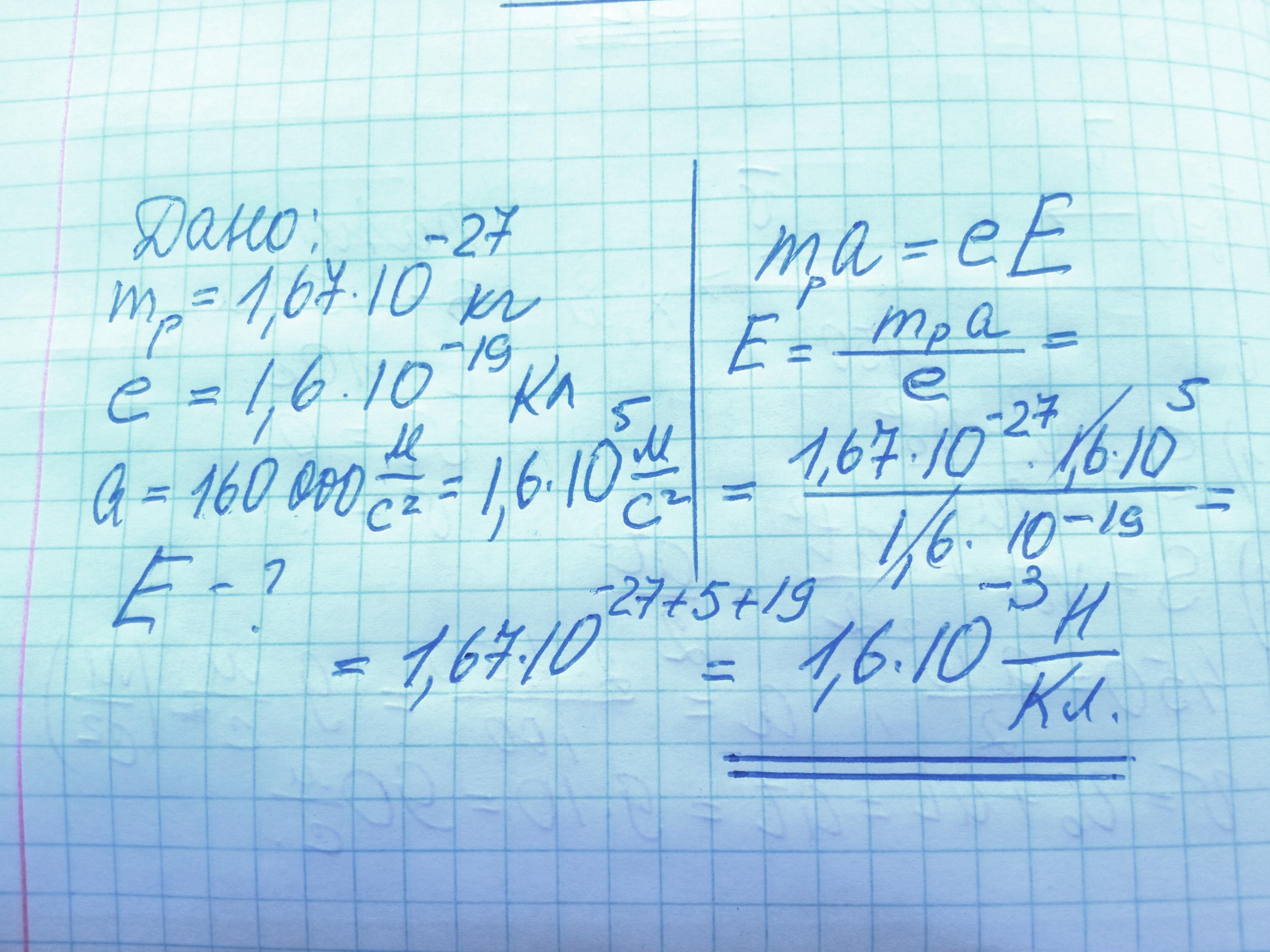 найти напряженеость поля если протон массой 1.67×10^-27 и зарядом 1.6×10^-19 кл движется в нем с ускорением 160 тыс. метр в секунду в квадрате