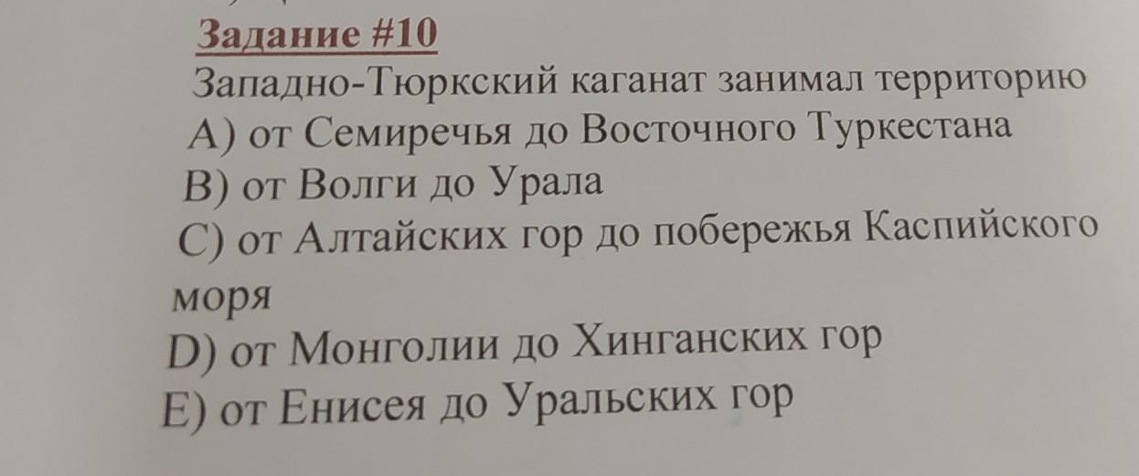Задание #10 Западно-Тюркский каганат занимал территорию А) от Семиречья до Восточного Туркестана В) от Волги до Урала С) от Алтайских гор до побережья Каспийского моря D) от Монголии до Хинганских гор E) от Енисея до Уральских гор