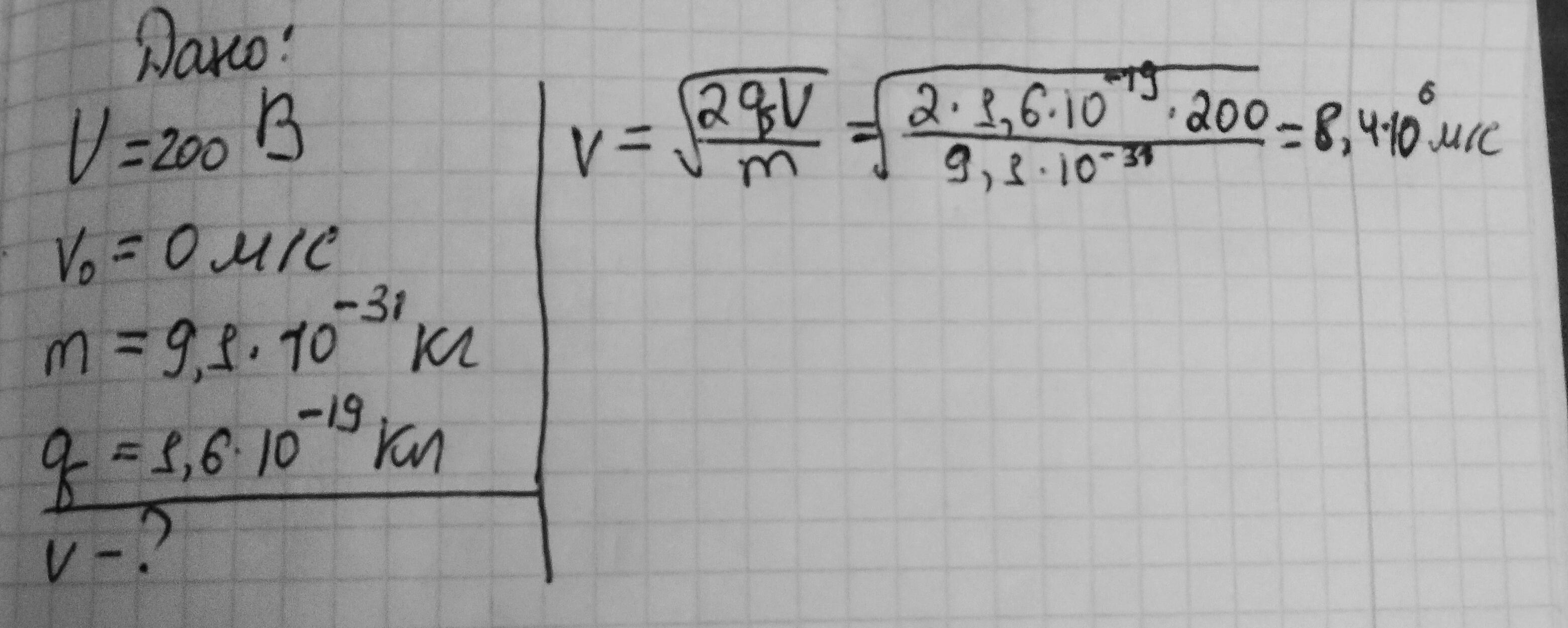 Чому дорівнює швидкість електрона, що пролетів прискорюючи різницю потенціалів 200 В? ( заряд електрона -1.6*10 Кл , маса електрона 9.1*10 кг?