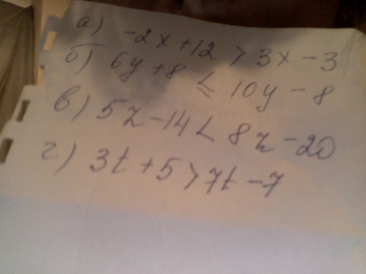 -2x+12>3x-3 6y+8<=10y-8 5z-14<8z-20 3t+5>7t-7