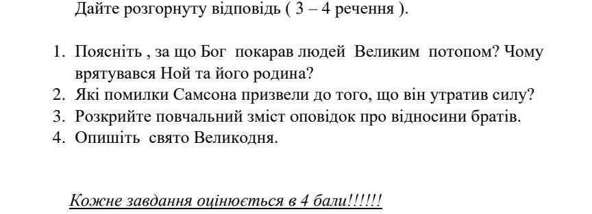 1. Згідно біблійного повідомлення, Бог покарав людей Великим потопом через їхню беззаконність та злочинність, що заповнили землю. Лише Ной, його родина та тварини, яких він зберіг у ковчезі, були справедливими та гідними врятуватися від гніву Божого.