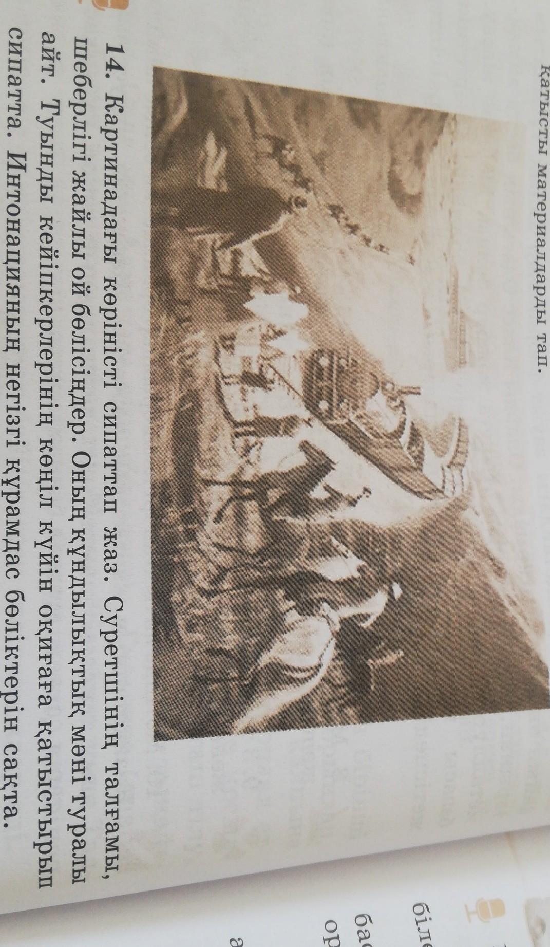 И 13 14. Картинадағы көріністі сипаттап жаз. Суретшінің талғамы, шеберлігі жайлы ой бөлісіңдер. Оның құндылықтық мәні туралы айт. Туынды кейіпкерлерінің көңіл күйін оқиғаға қатыстырып сипатта. Интонацияның негізгі құрамдас бөліктерін сақта. б