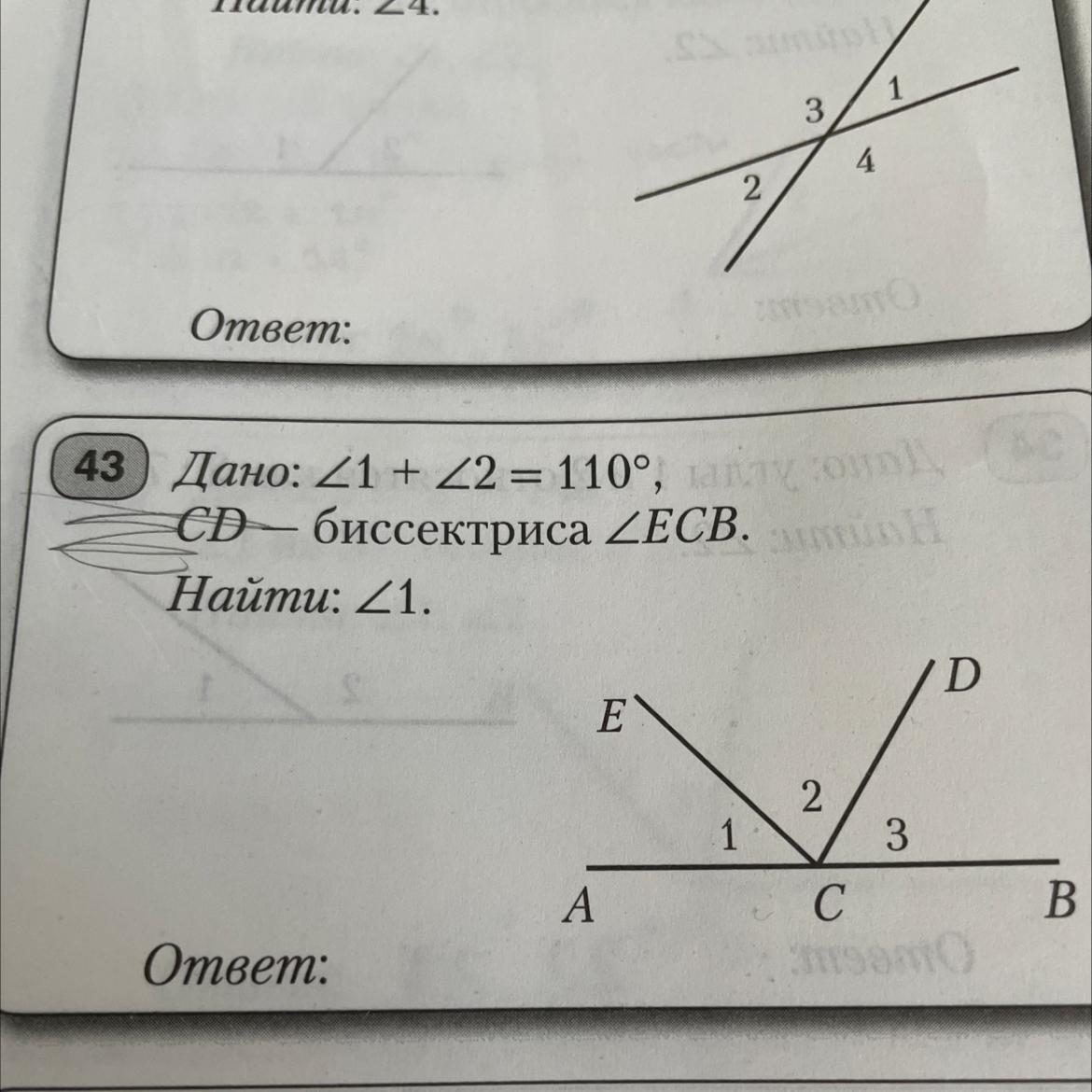 Дальше по условию видим что ECD поделили биссектрисой CD, а это означает что угол ECD и DCB то есть угол 2 и 3 равны, если угол 3 у нас мы нашли 70 то и угол 2 тоже 70. А теперь найдем угол 1: Угол 1 обозначим как "y" 2) y + 70 = 110 y= 110-70 y=40