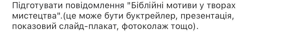 Біблійні мотиви в мистецтві мають довгу і багату історію і відображають важливий аспект культури та сакральних тем у творчості різних епох і стилів. Ці мотиви можуть бути знайдені в різних виданнях мистецтва, включаючи живопис, скульптуру, архітектуру, літературу та інше. Ось кілька прикладів біблійних мотивів у творах мистецтва: