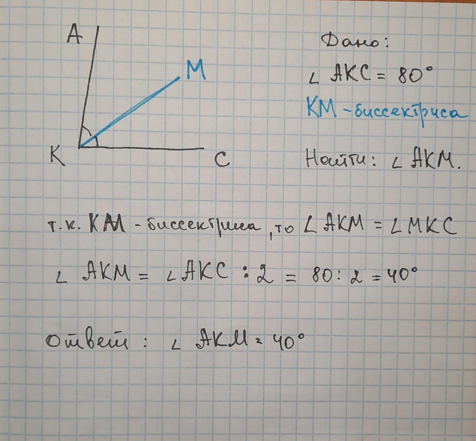 ∠АКМ = ∠АКС : 2 = 80° : 2 = 40°