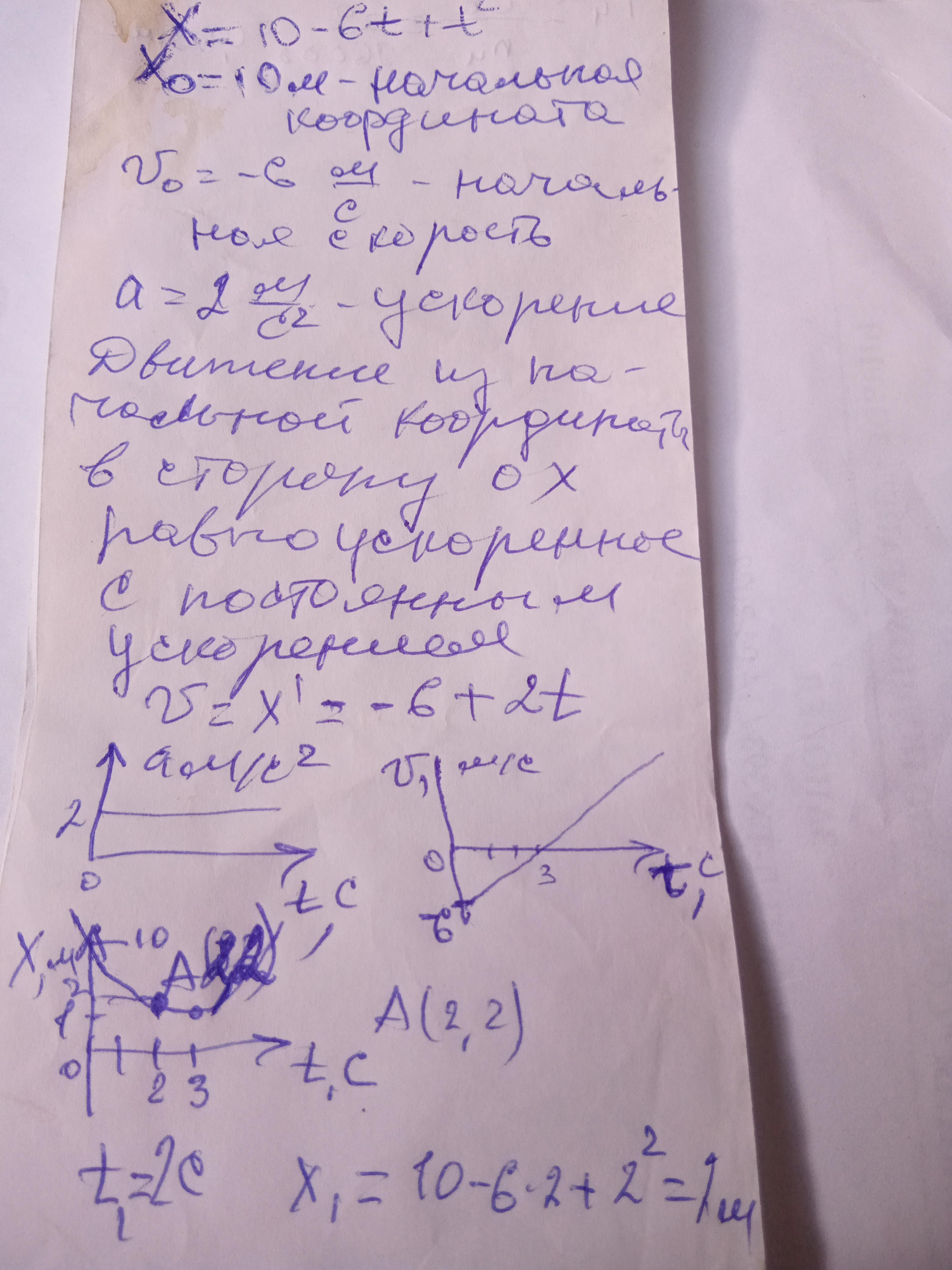 Рівняння руху тіла має вигляд x=10-6t + t². Опишіть характер руху тіла. Запишіть формулу залежності проекції швидкості від часу. Побудуйте графік залежності прискорення, швидкості та координати від часу. Визначте модуль переміщення тіла за перші 2 с руху