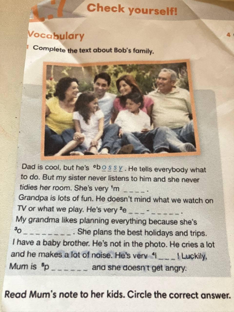 Dad is cool, but he's bossy. He tells everybody what to do. But my sister never listens to him and she never tidies her room. She's very messy. Grandpa is lots of fun. He doesn't mind what we watch on TV or what we play. He's very easy-going. My grandma likes planning everything because she's organised. She plans the best holidays and trips. I have a baby brother. He's not in the photo. He cries a lot and he makes a lot of noise. He's very loud! Luckily, Mum is patient and she doesn't get angry.