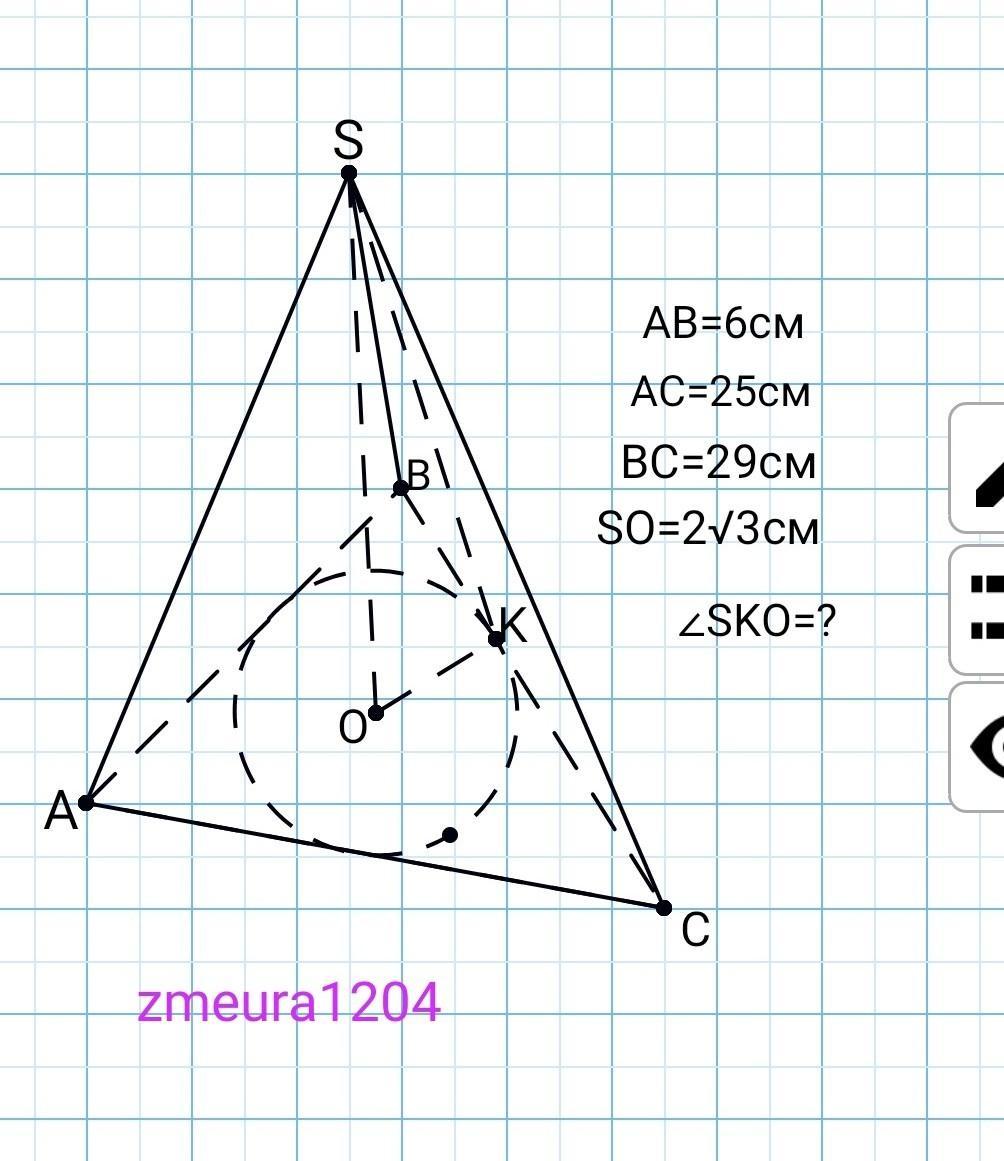 Основою піраміди є трикутник зі сторонами 6 см, 25 см і 29 см. Усі бічні грані однаково нахилені до основи піраміди. Який кут утворюють бічні грані з основою, якщо висота піраміди дорівнює 2√3 см?