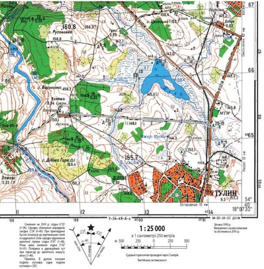 Тема уроку: Практична робота №1 Визначення напрямків, відстаней, площ, географічних і прямокутних координат, висот точок за топографічною картою. Хід роботи Використовуючи умовні знаки і масштаб топографічної карти, виконайте завдання. 1. Знайдіть гору Волинську: А) визначте її абсолютну висоту та обчисліть відносну висоту щодо урізу води озера; Б) визначте географічні та прямокутні координати; В) виміряйте за допомогою транспортира азимут напрямку на центр найбільшого населеного пункту (церква) та обчисліть відстань між ними. 2. Обчисліть приблизну площу найбільшого населеного пункту. 3. Опишіть квадрат в якому знаходиться гора Волинська, вказуючи напрямки. Наприклад: На заході знаходиться... А) назвіть внутрішні води; Б) рослинний покрив; В) інші об'єкти, транспортні шляхи, що є в цьому квадраті.