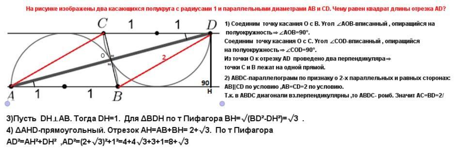 На рисунке изображены два касающихся полукруга с радиусами 1 и параллельными диаметрами АВ и CD. Чему равен квадрат длины отрезка AD?