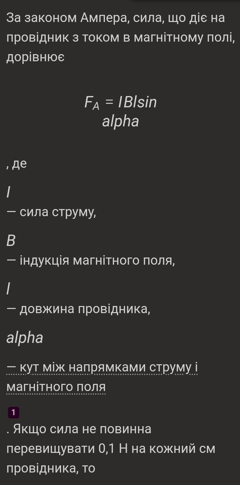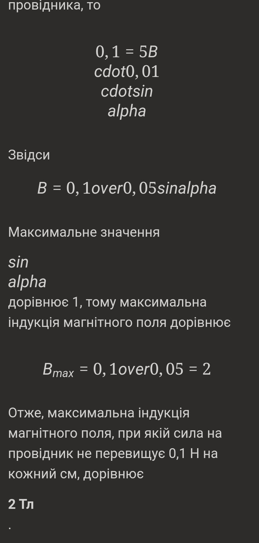 Визначте максимальну індукцію магнітного поля, якщо на кожний см провідника, сила струму в якому дорівнює 5А, це поле не повинно діяти із силою більшою за 0,1 Н
