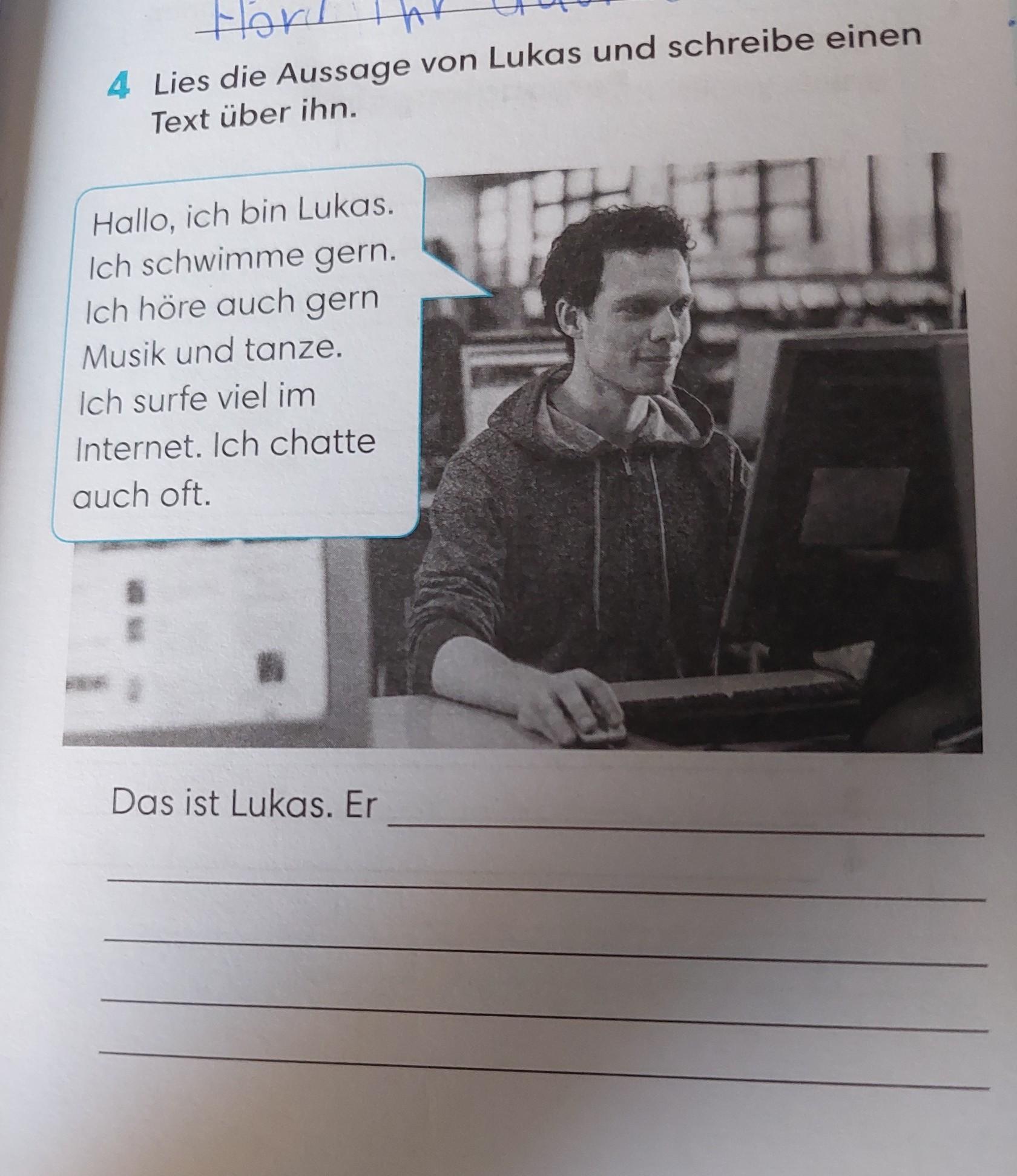 Das ist Lukas. Er schwimmt gern. Er hört auch gern musik and tanzt. Er surft viel im Internet. Er chattet auch fot.