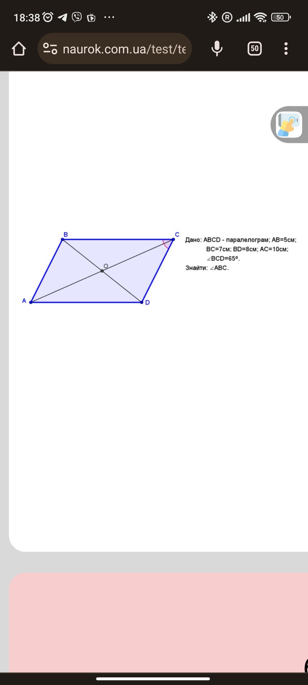 Дано: АВСD паралелограм, АВ = 5см, ВС= 7CM, BD = 8CM, AC = 10CM, <BAC = 40°