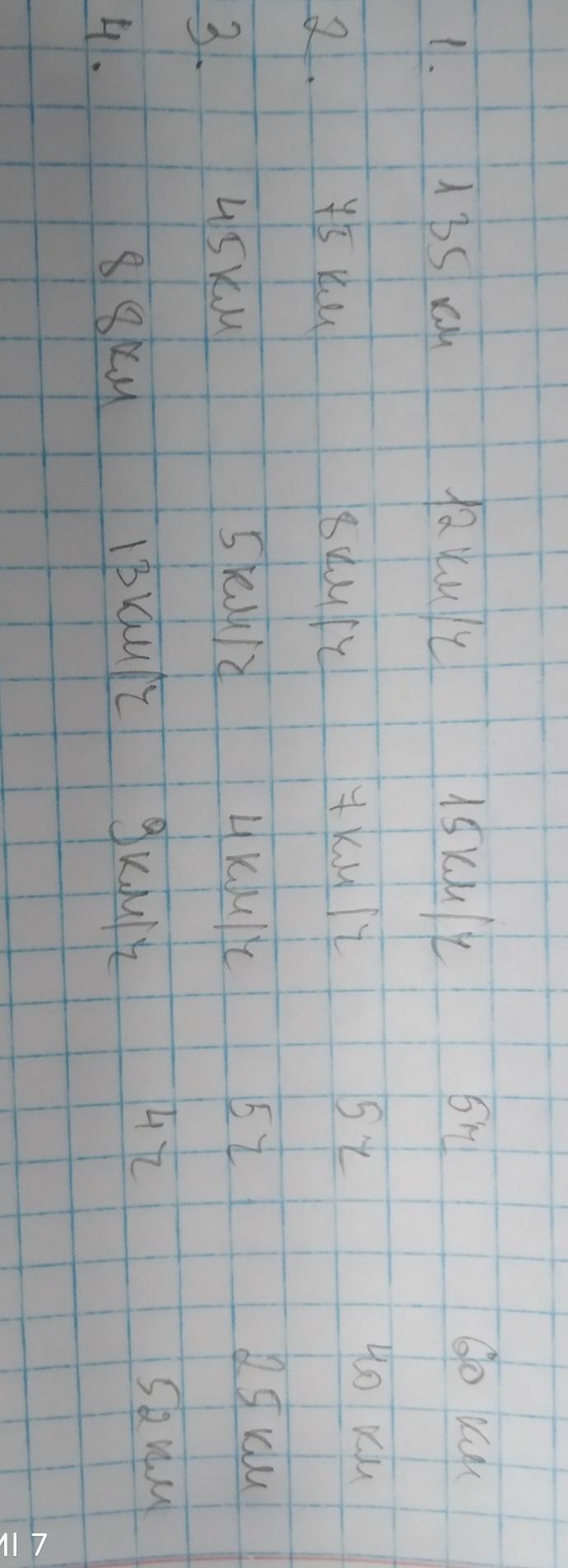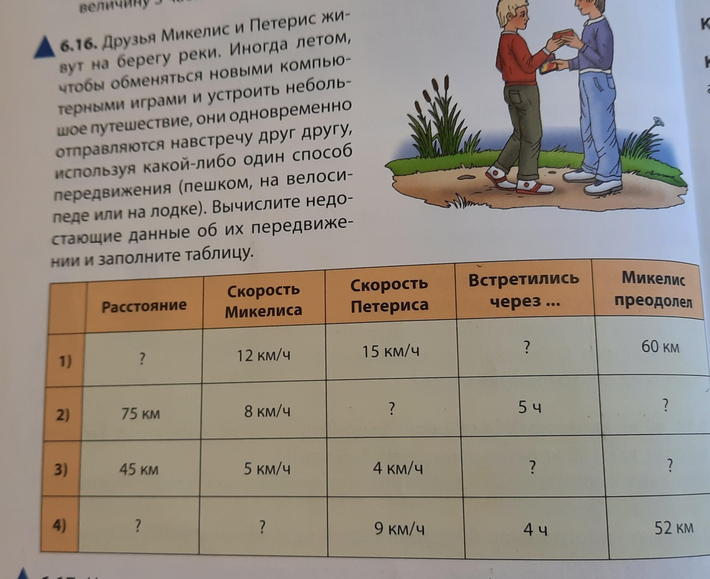 6.16. Друзья Микелис и Петерис жи- вут на берегу реки. Иногда летом, чтобы обменяться новыми компью- терными играми и устроить неболь- шое путешествие, они одновременно отправляются навстречу друг другу, используя какой-либо один способ передвижения (пешком, на велоси- педе или на лодке). Вычислите недо- стающие данные об их передвиже- нии и заполните таблицу. 1) 2) 3) B 4) Расстояние ? 75 км 45 км ? Скорость Микелиса 12 км/ч 8 км/ч 5 км/ч ? Скорость Петериса 15 км/ч ? 4 км/ч 9 км/ч Х.Б Встретились через.. ? 5 ч ? 4 ч ... Микелис преодолел 60 км ? ? 52 км