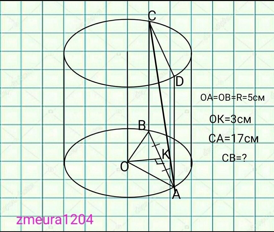 У циліндрі паралельно його осі на відстані 3 см від неї проведено переріз, діагональ якого дорівнює 17 см. Знайдіть висоту циліндра,якщо радіус дорівнює 5 см