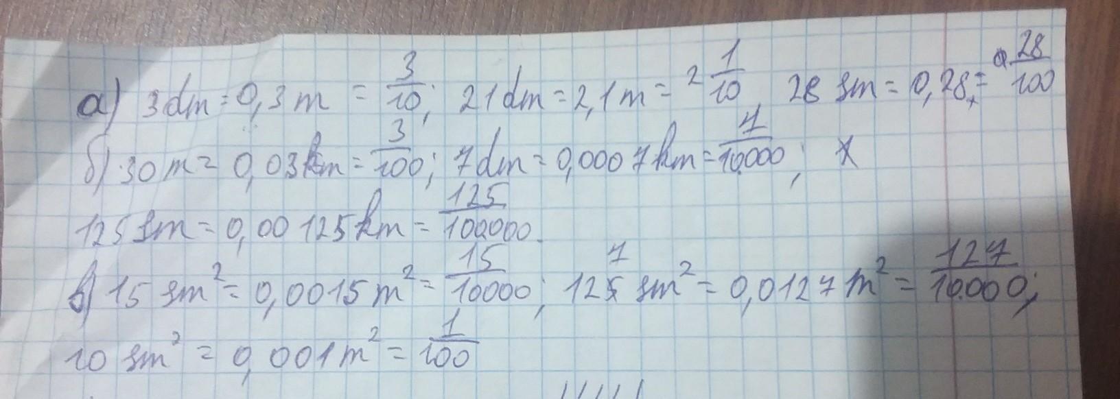 . Запиши в виде десятичных дробей и вырази: а. в метрах: 3 дм; 21 дм; 28 см. б. в километрах: 30 м; 7 дм; 125 см. в. в тоннах: 16 кг; 125 кг; 14 кг; 125 г. г. в квадратных метрах: 15 см²; 127 см²; 10 см² д. в лари: 137 тетри; 25 тетри; 87 тетри; 123 тетри