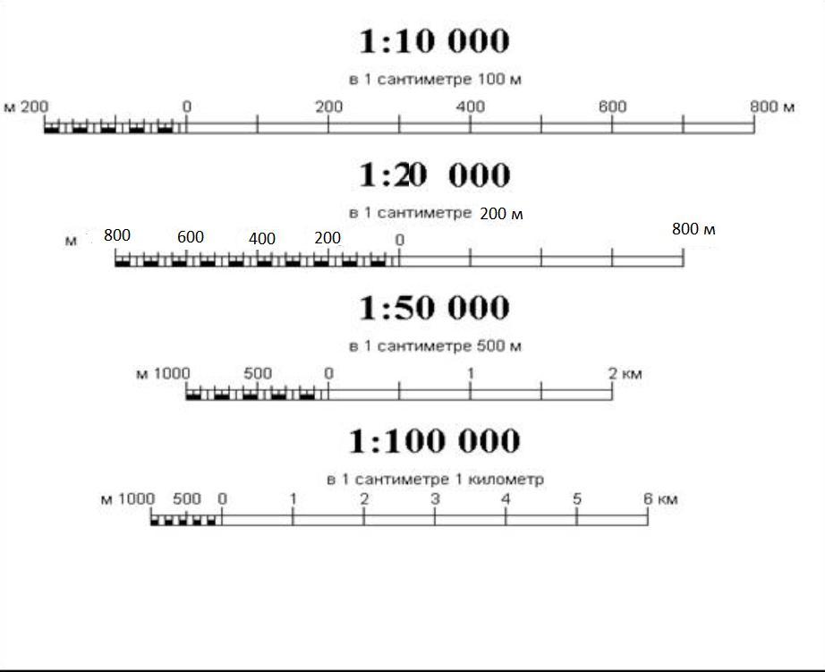 - Ми зобразили у вигляді відрізків відстань, яка дорівнює 1 км, у різних асштабах: а) у масштабі 1 : 10 000, б) у масштабі 1 : 20 000, в) у масштабі 1 : 50 000, г) у масштабі 1 : 100 000