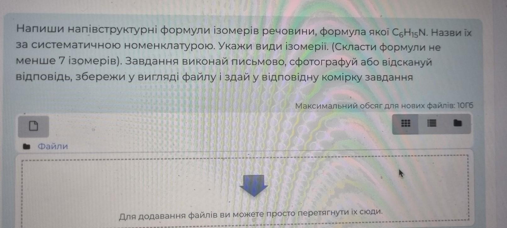 Напиши напівструктурні формули ізомерів речовини, формула якої C6H15N. Назви їх за систематичною номенклатурою. Укажи види ізомерії. (Скласти формули не менше 7 ізомерів). Завдання виконай письмово, сфотографуй або відскануй відповідь, збережи у вигляді файлу і здай у відповідну комірку завдання