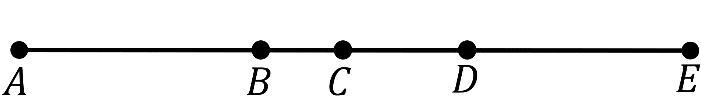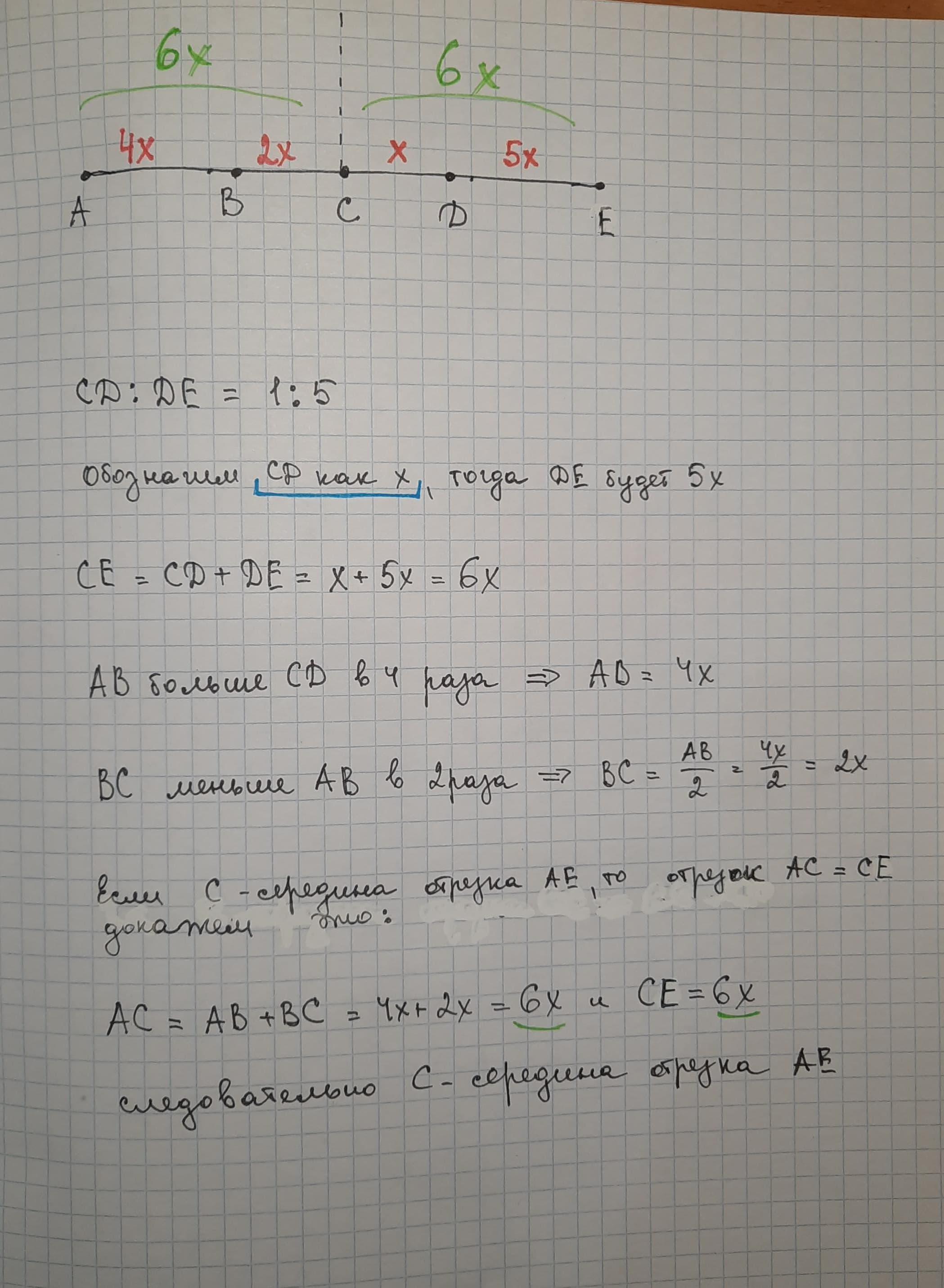 Точки A, B, C, D і E розміщені на одній прямій (див. рис.). Доведіть, що точка С –середина відрізка АЕ, якщо АВ більший за СD у 4 рази, ВС менший від АВ у 2 рази, СD : DЕ = 1 : 5.