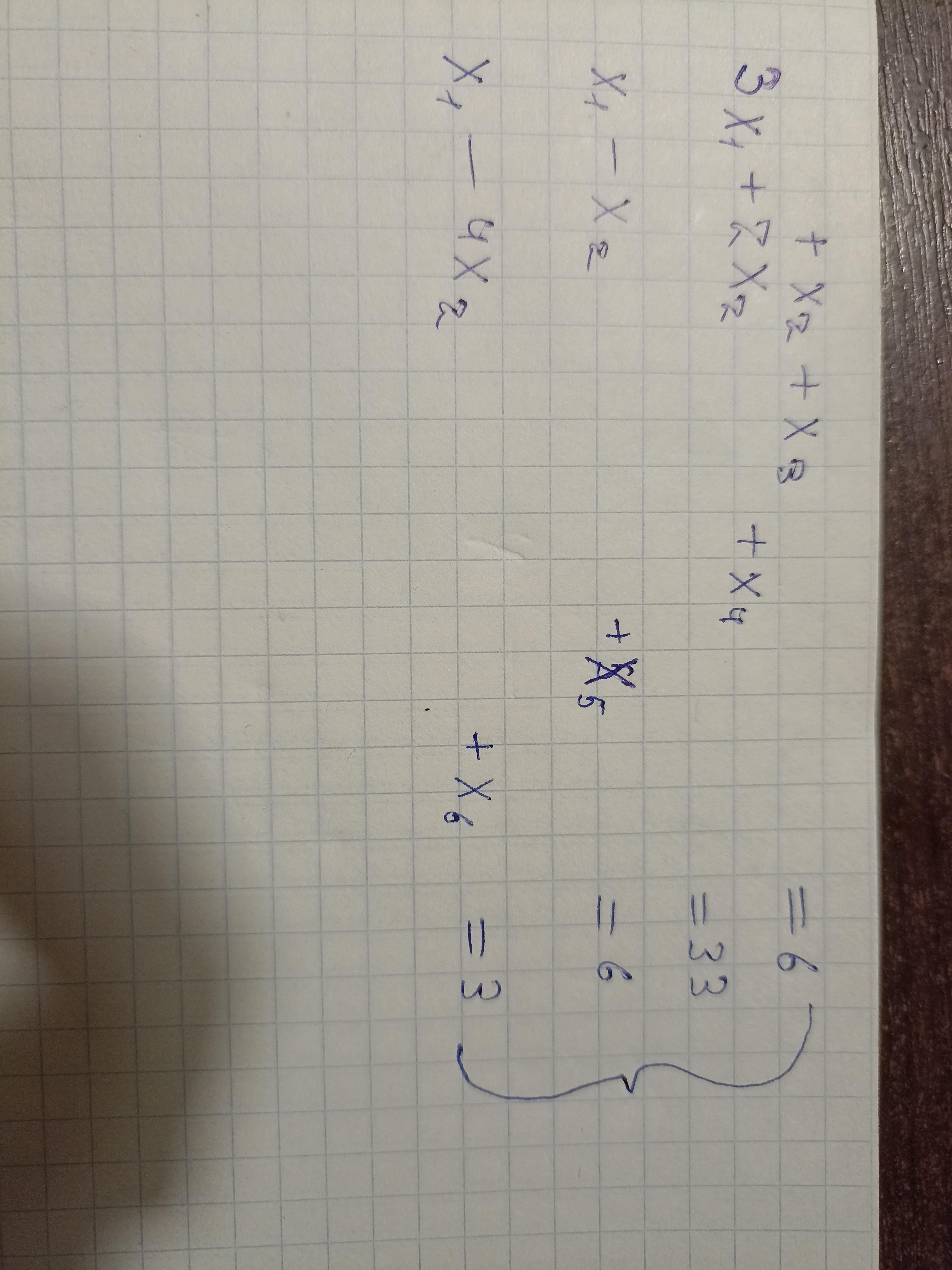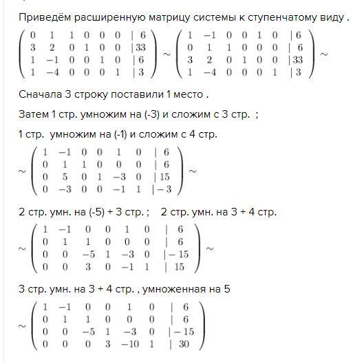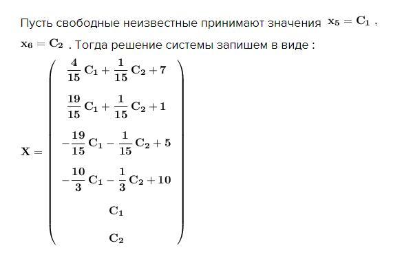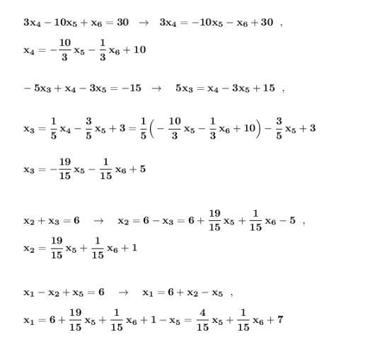 Выбираем базисные неизвестные . Это будут х₁ , х₂ , х₃ , х₄ , так как определитель, составленный из первых 4-х столбцов отличен от 0 и равен -15 ≠ 0 . Свободными неизвестными будут х₅ , х₆ .
