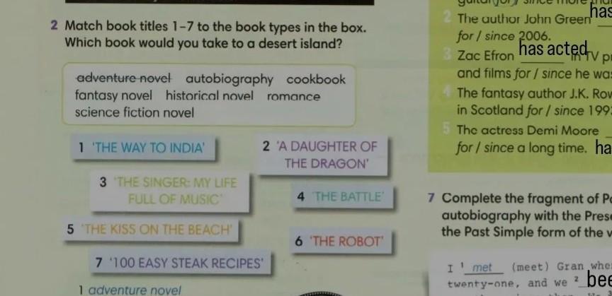 2 Match book titles 1-7 to the book types in the box. Which book would you take to a desert island? adventure novel autobiography cookbook fantasy novel historical novel romance science fiction novel 1 'THE WAY TO INDIA' 3 'THE SINGER: MY LIFE FULL OF MUSIC 5 THE KISS ON THE BEACH' 2 'A DAUGHTER OF THE DRAGON' 7 '100 EASY STEAK RECIPES' 1 adventure novel 4 THE BATTLE' 6 'THE ROBOT'