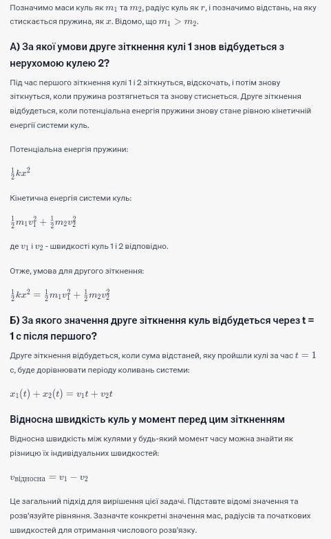 А) Для того щоб друге зіткнення кулі 1 знову відбулося з нерухомою кулею 2, потрібно, щоб куля 1 відскочила від стінки так, що її швидкість змінилася і стала від'ємною. Це станеться, якщо куля 1 відскочить від стінки з достатньою великою швидкістю і покине пружину до моменту другого зіткнення.
