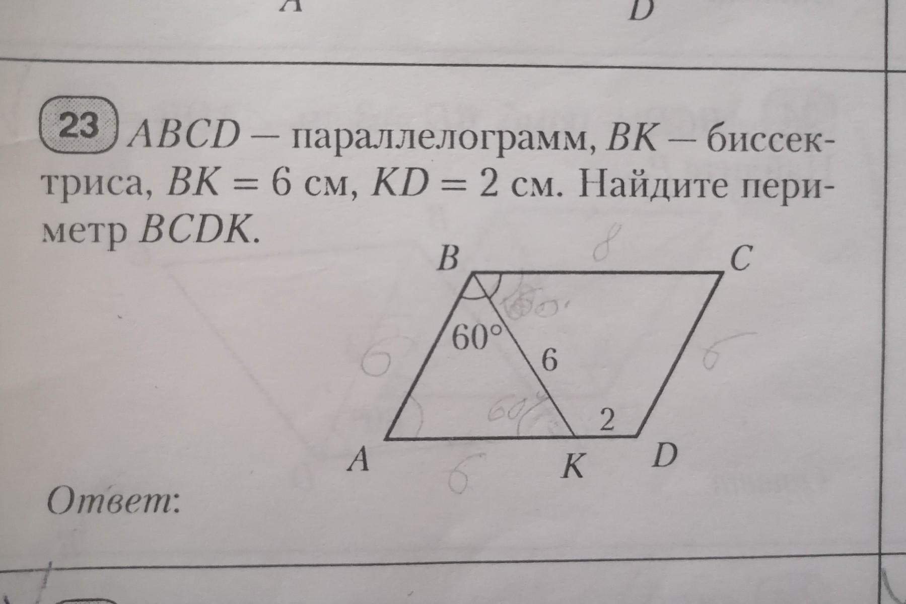ABCD-паралеллограмм, BK=6см KD=2см. Найдите периметр BCDK.