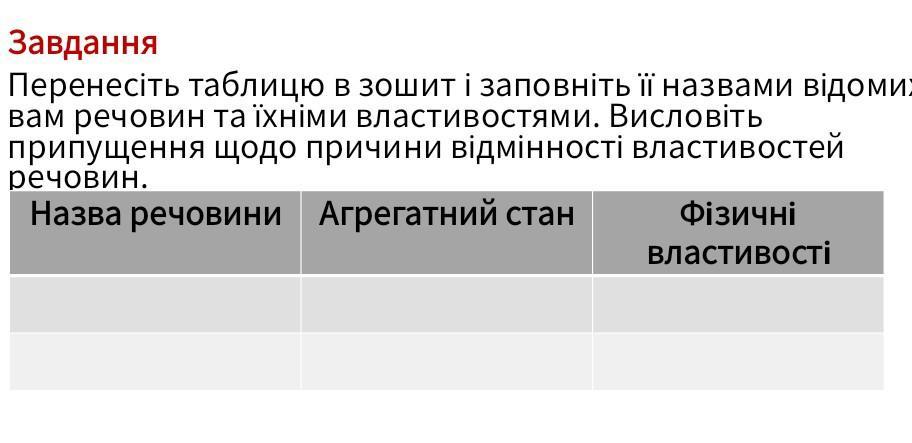 Перенесіть таблицю в зошит і заповніть її назвами відомих вам речовин та їхніми властивостями. Висловіть припущення щодо причини відмінності властивостей речовин. Назва речовини Агрегатний стан Фізичні властивості