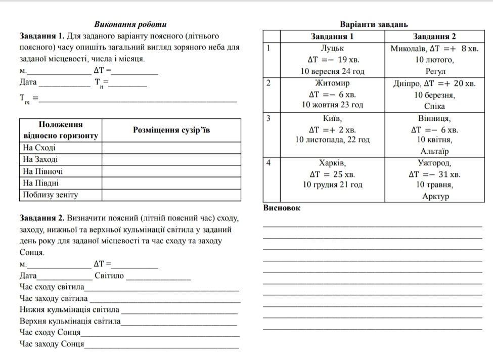 Завдання 1. Для заданого варіанту поясного (літнього поясного) часу опишіть загальний вигляд зоряного неба для заданої місцевості, числа і місяця.