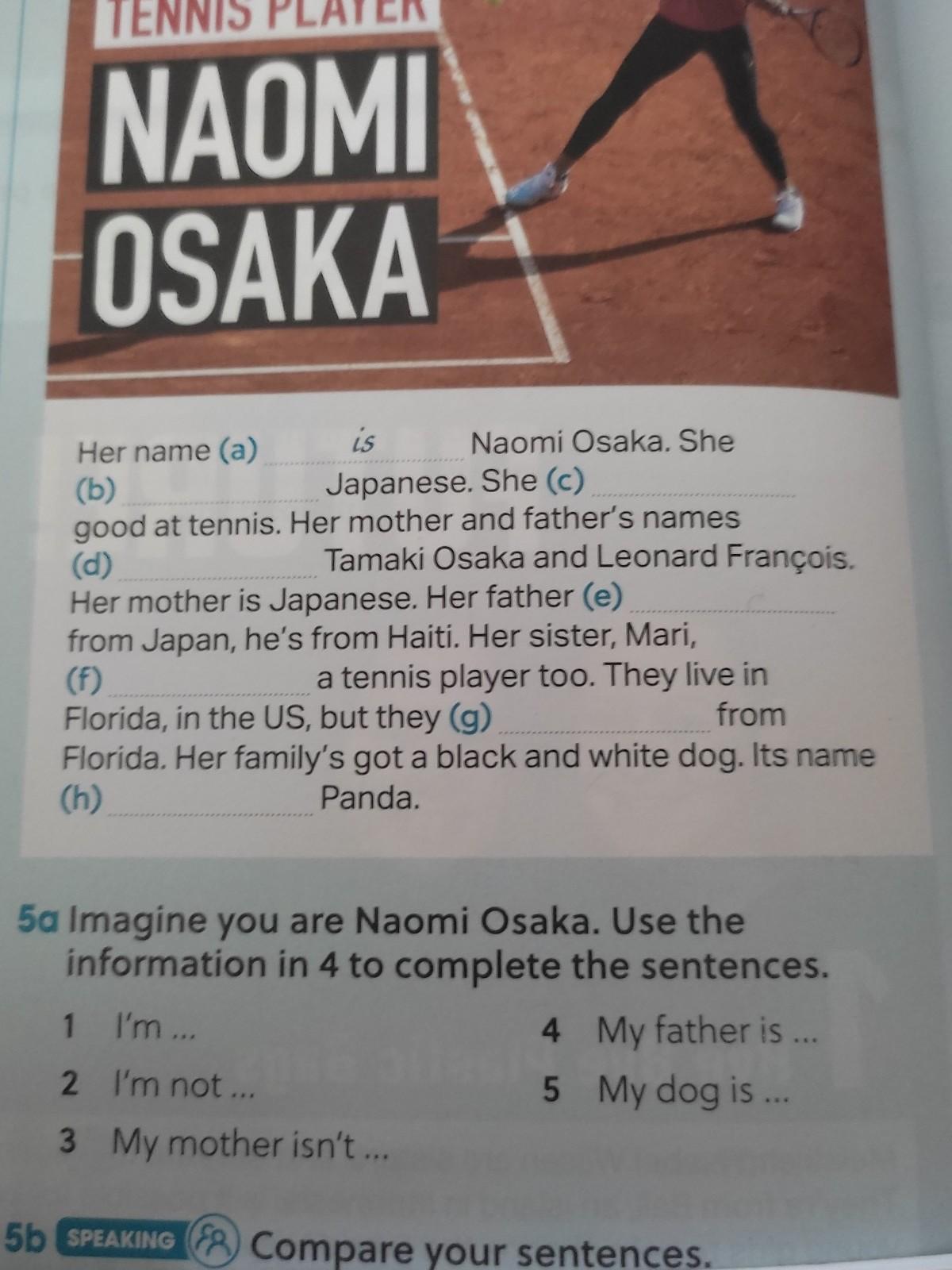 Her name is Naomi Osaka. She is Japanese. She is good at tennis. Her mother and father's names are Tamaki Osaka and Leonard François. Her mother is Japanese. Her father isn't from Japan, he's from Haiti. Her sister Mari, also a tennis player too. They live in Florida, in the US, but they aren't from Florida. Her family's got a black and white dog. Its name is Panda.