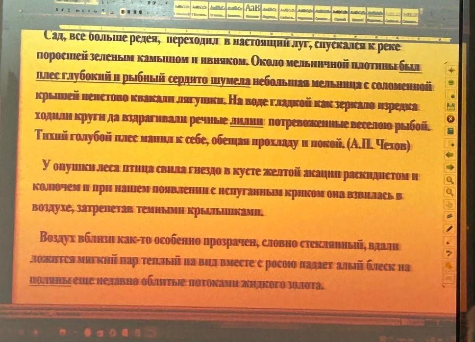 Сад, все больше редея, переходил в настоящий луг, спускался к реке поросшей зеленым камышом и ивняком. Около мельничной плотины был плес глубокий и рыбный сердита шумела небольшая мельница с соломенной крышей неистово квакали лягушки. На вер ходили круги да вздрагивали речные лилни потревоженные веселою рыбой. Тний голубой плес манил к себе, обещая прохладу и покой. (А.П. Чехов) У У опушки леса птица свила гнездо в кусте желтой акции раскидистом и колючем и при нашем появлении с испуганны криком она взвилась в воздухе, затрепетав темными крылышками. Воздух вблизи как-то особенно прозрачен, словно стеклянный, вдалн ложится мягкий пар теплый павил вместе с росою надает алый блеск на поляныеще недавна облитые потокажкого золота.