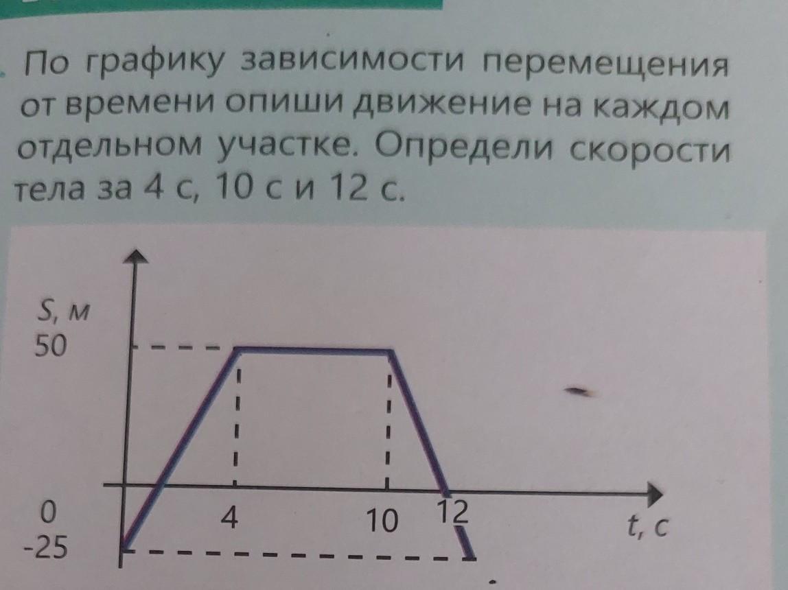 По графику зависимости перемещения от времени опиши движение на каждом отдельном участке. Определи скорости тела за 4 с, 10 си 12 с.