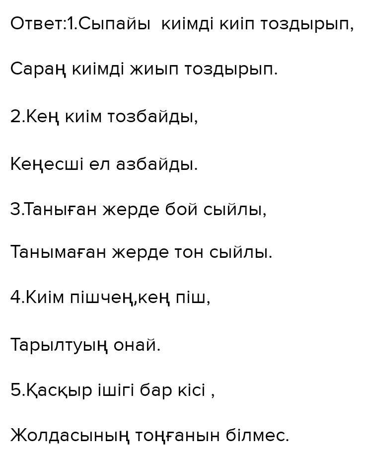 6. Макал-мәтелдердің жалғасын тауып, айтылуы мен жазылуында ерекшелік бар сез- дерді топтастырып жазыңдар. 1. Сыпайы киiмдi киiп тоздырады. 2. Кен киiм тозбайды, 3. Таныған жерде бой сыйлы, 4. Киім пішсен, кең піш, 5. Қасқыр ішігі бар кiсi А) танымаган жерде тон сыйлы. в) тарылтуын онай. C) кенесші ел азбайды. Д) жолдасынын тонганын білмес. E) саран киiмдi жнып тоздырады.