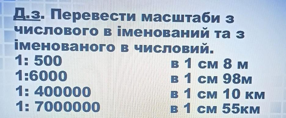 Перевести масштаби з числового в іменований та з іменованого в числовий. в 1 см 8 м в 1 см 98м В 1 см 10 км в 1 см 55км 1: 500 1:6000 1: 400000 1: 7000000