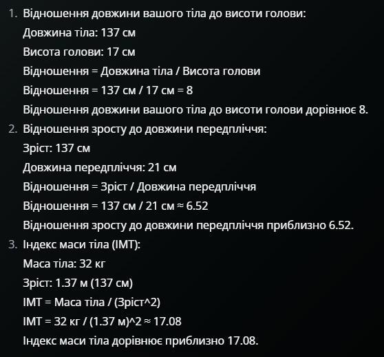 #1 )Знайдіть відношення довжини вашого тіла до висоти голови