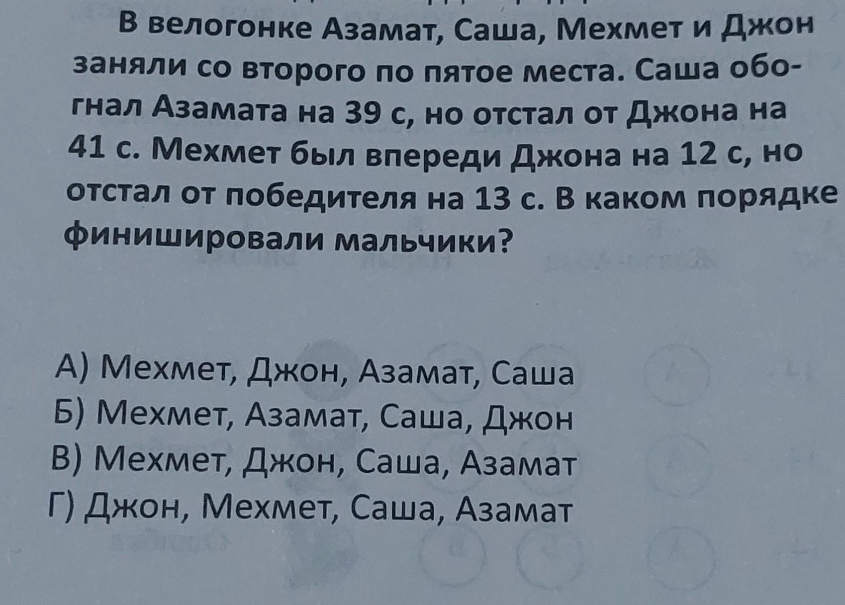 В велогонке Азамат, Саша, Мехмет и Джон заняли со второго по пятое места. Саша обо- гнал Азамата на 39 с, но отстал от Джона на 41 с. Мехмет был впереди Джона на 12 с, но отстал от победителя на 13 с. В каком порядке финишировали мальчики? А) Мехмет, Джон, Азамат, Саша Б) Мехмет, Азамат, Саша, Джон В) Мехмет, Джон, Саша, Азамат Г) Джон, Мехмет, Саша, Азамат Поомогите пж