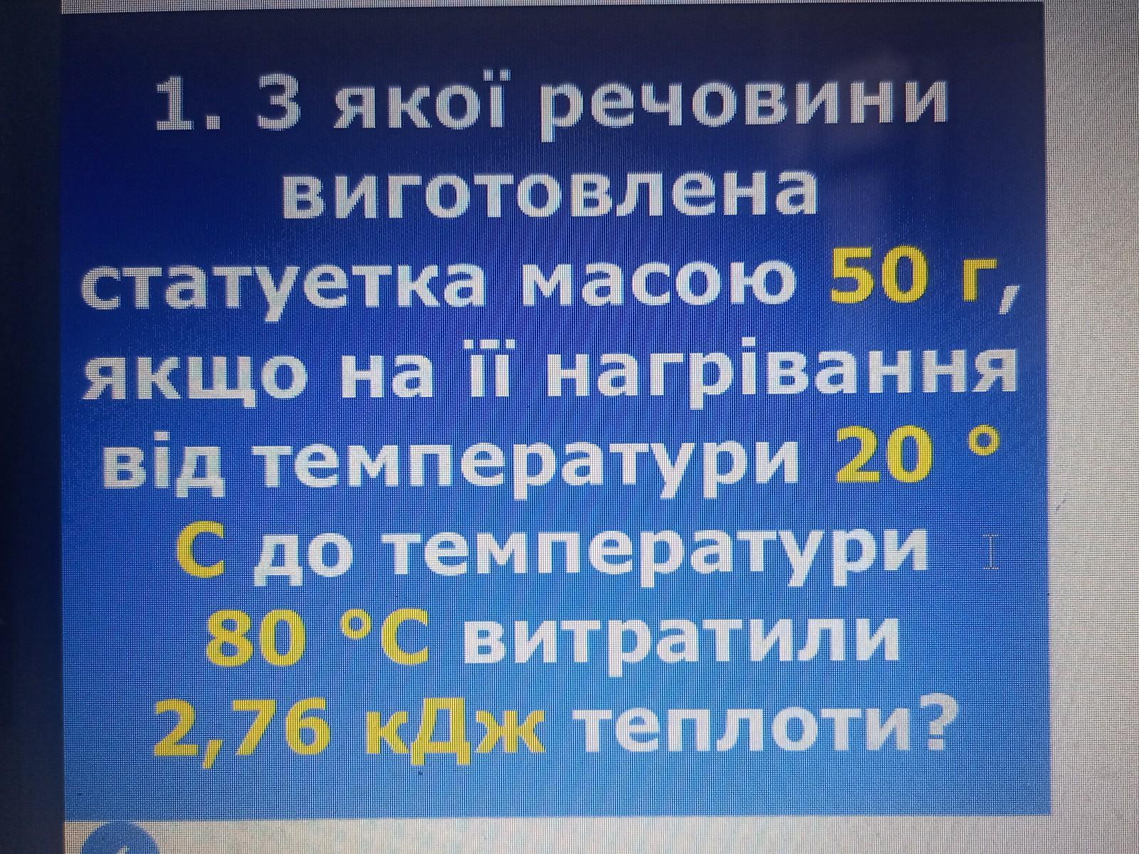 c=Q/m(t2-t2)=2760/0,05(80-20)=2760/0,05*60= 2760/3= 920Дж/кг*°С алюминий