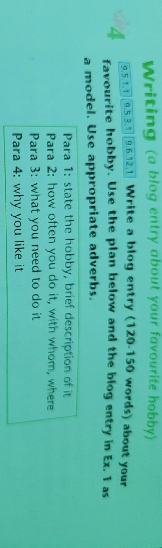 Writing (a blog entry about your favourite hobby) 4 9.5.1.1 9.5.3.1 9.6.12.1 Write a blog entry (120-150 words) about your favourite hobby. Use the plan below and the blog entry in Ex. 1 as a model. Use appropriate adverbs. Para 1: state the hobby, brief description of it Para 2: how often you do it, with whom, where Para 3: what you need to do it Para 4: why you like it