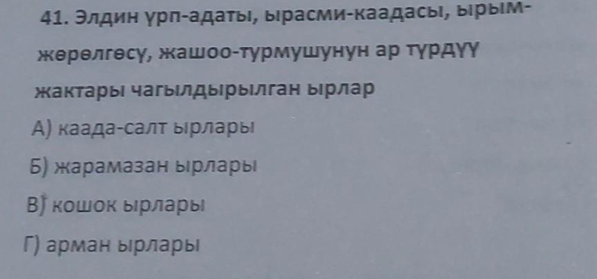 41. Элдин урп-адаты, ырасми-каадасы, ырым- жерелгесу, жашоо-турмушунун ар түрдүү жактары чагылдырылган ырлар А) каада-салт ырлары Б) жарамазан ырлары В) кошок ырлары Г) арман ырлары FEM