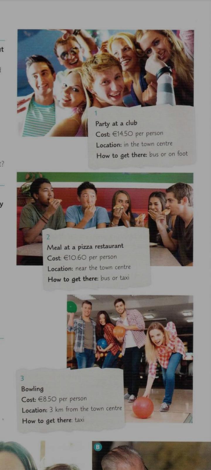 Work in pairs. Read the information about the three party celebrations (1-3) and do the role-play task. The situation You and your group of friends are planning to celebrate a friend's birthday in a week's time The task Look at the options 1, 2 and 3 and decide which type of celebration is the best. Discuss each option and consider ▷ the cost, ▷ the location. ‣ how you would get there and back.