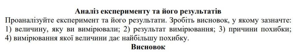 Аналіз експерименту та його результатів Проаналізуйте експеримент та його результати. Зробіть висновок, у якому зазначте: 1) величину, яку ви вимірювали; 2) результат вимірювання; 3) причини похибки; 4) вимірювання якої величини дає найбільшу похибку. Висновок