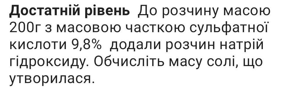 частка солі в розчині становить 12 ДОСТатній рівень До розчину масою 200г з масовою часткою сульфатної кисло и 9,8% додали розчин натрій гідроксиду. Обчисліть масу солі, що утворилася. Високий кiречь