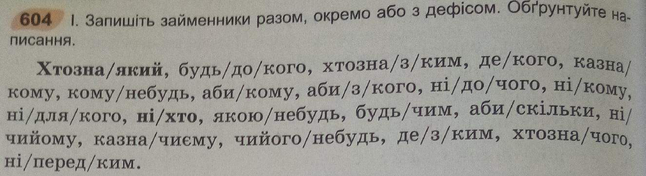 хтозна-який, будь до кого, хтозна з ким, де кого, казна-кому (казна- завжди через дефіс), кому-небудь, аби кому, аби з кого, ні до чого, нікому, ні для кого, ніхто, якою-небудь, будь-чим, аби скільки, ні чийому, казна-чиєму, чийого-небудь, де з ким, хтозна-чого, ні перед ким