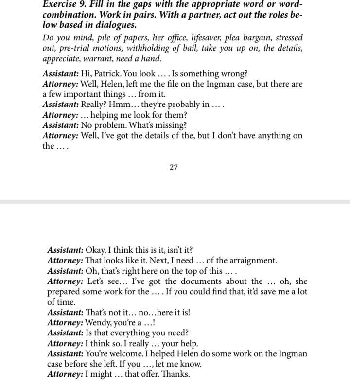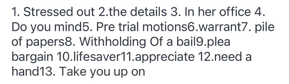 1. Stressed out 2.the details 3. In her office 4. Do you mind5. Pre trial motions6.warrant7. pile of papers8. Withholding Of a bail9.plea bargain 10.lifesaver11.appreciate 12.need a hand13. Take you up on